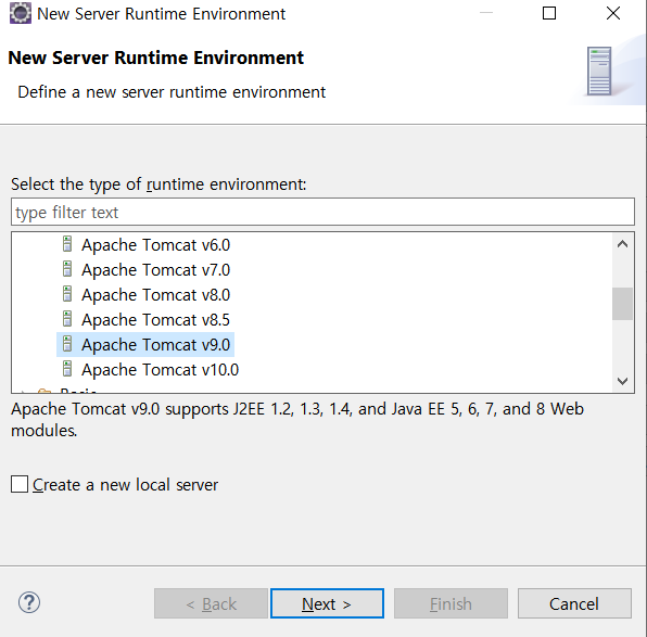 - 필자는 톰캣9라서 Apache Tomcat v9.0선택