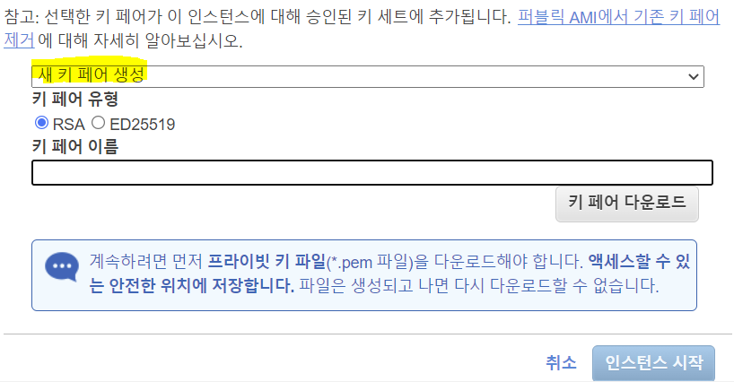1. [새 키 페어 생성] -> 키 페어 이름은 마음대로 설정