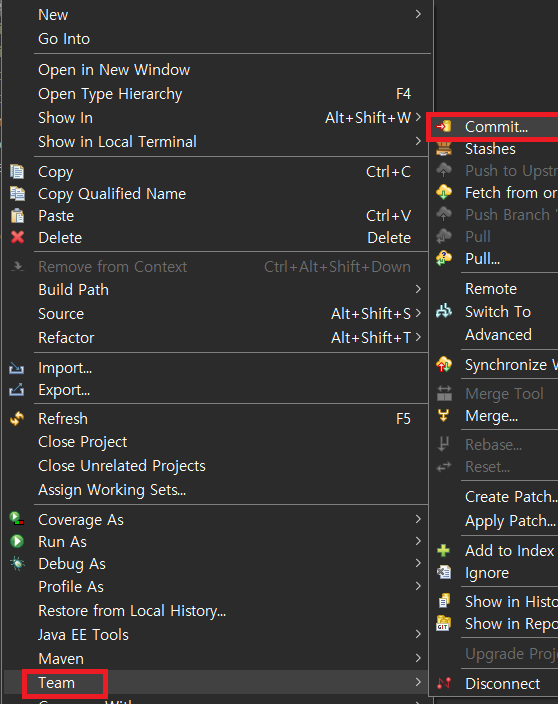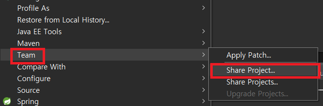1. 프로젝트 우클릭해서 [Team] -> [Share Project...] 클릭