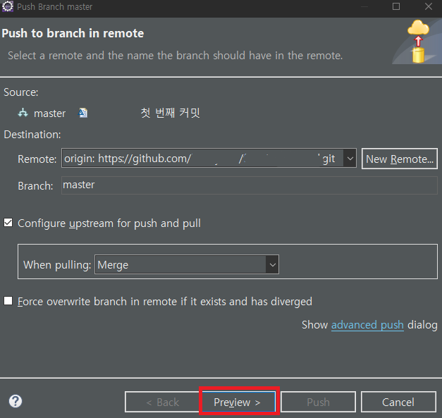 만약, 기존 프로젝트를 받아서 올리는 것이라면 Commit -> Merge를 한 후에 PUSH를 해야 한다.