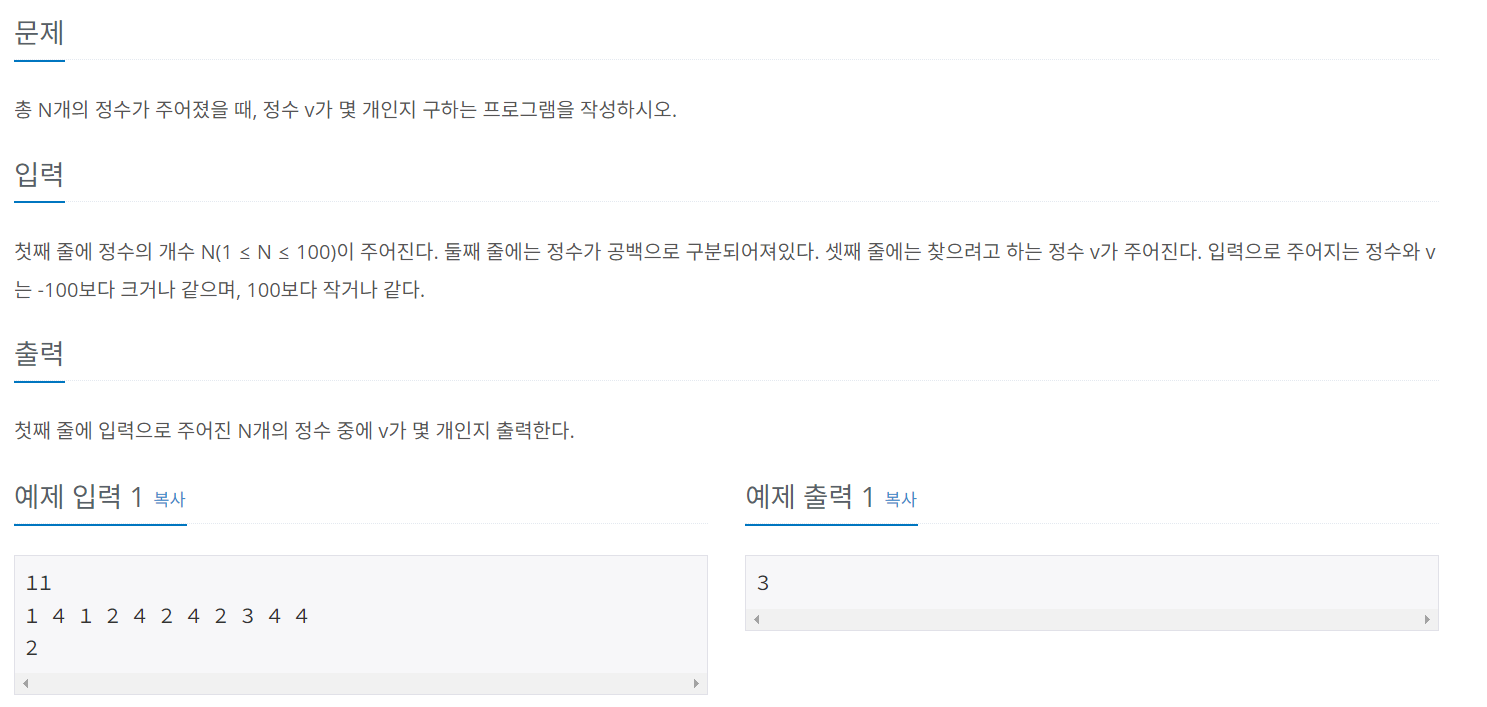 첫째 줄에 정수의 개수 N(1 ≤ N ≤ 100)이 주어진다. 둘째 줄에는 정수가 공백으로 구분되어져있다. 셋째 줄에는 찾으려고 하는 정수 v가 주어진다. 입력으로 주어지는 정수와 v는 -100보다 크거