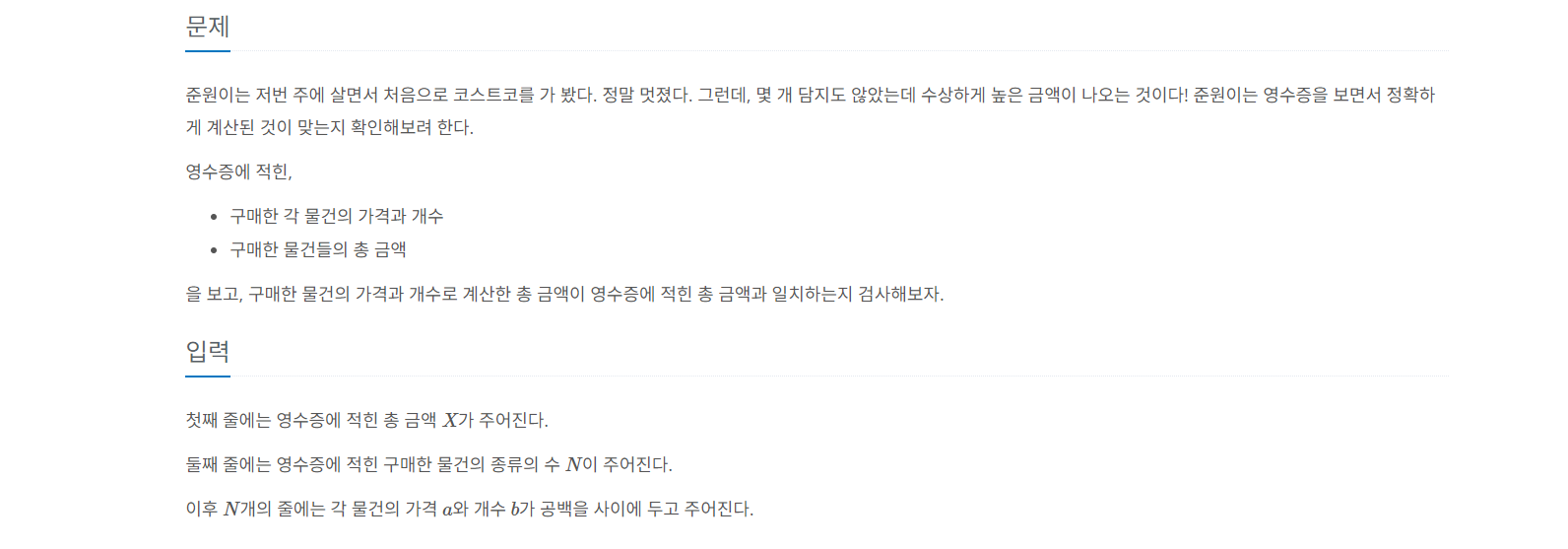 준원이는 저번 주에 살면서 처음으로 코스트코를 가 봤다. 정말 멋졌다. 그런데, 몇 개 담지도 않았는데 수상하게 높은 금액이 나오는 것이다! 준원이는 영수증을 보면서 정확하게 계산된 것